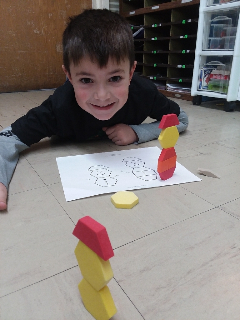 Kindergarteners @AGSschools are building holiday/winter pictures with pattern blocks during centers this week. Who knew they could be up and alive instead of flat on the paper!? Nice out of the box thinking, kiddo! #AGSdailyshare #wolverineslead
